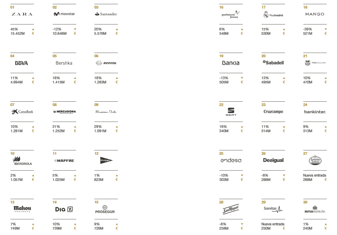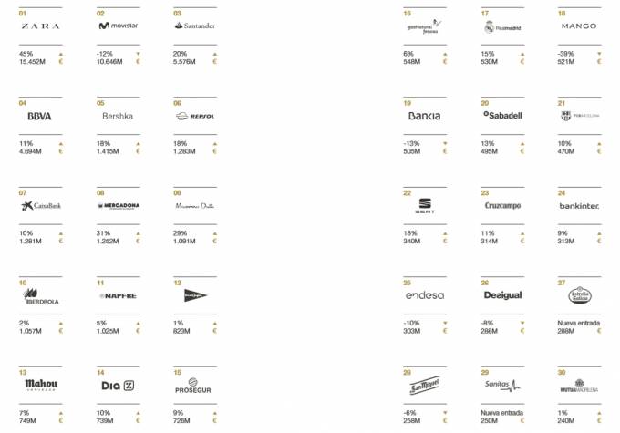 En la clasificación global, el liderazgo es para Zara (15.452 millones y un crecimiento del 45%), por delante de Movistar (10.646 millones y un descenso del 12%) y Banco Santander (5.576 millones y un aumento del 20%). Como ya se ha indicado, Mapfre ocupa el puesto 11; Sanitas, el 29; y Mutua Madrileña, el 30.