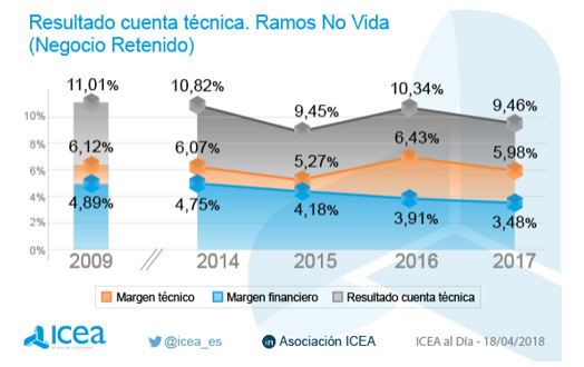El informe también presenta los datos del margen técnico y del resultado de la cuenta técnica de los ramos de No Vida. Este último se ha reducido desde 2009 un 14% hasta situarse el pasado año en el 9,46%. Por su parte, el margen técnico ha empeorado en este periodo un 2,3%.