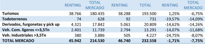 Las matriculaciones de renting han caído 1,71% en el mes de febrero acumulando en lo que va de año 45.942 vehículos. Las matriculaciones del total del mercado han sufrido una caída mucho mayor hasta el 7,75%. El peso del renting en el mercado total alcanza el 21,42%, según datos facilitados por la Asociación Española de Renting. Las inversiones por su parte crecen un 3,17% respecto al año anterior y alcanzan los 910 millones de euros.
