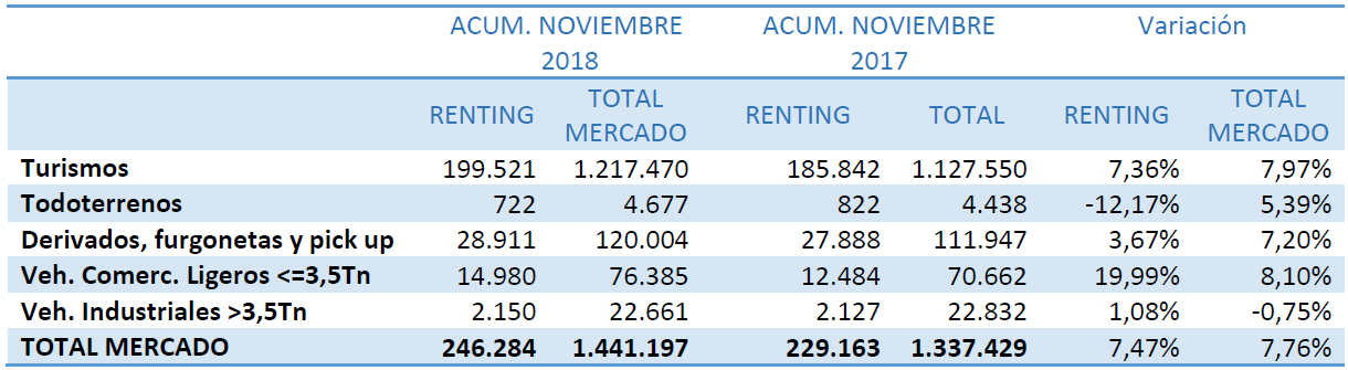 Las matriculaciones de vehículos registradas por las compañías de renting suman 246.284 unidades hasta noviembre, lo que significa un crecimiento del 7,47% respecto al mismo periodo del ejercicio anterior, según los datos publicados por la Asociación Española de Renting de Vehículos (AER). Con esta evolución, el peso del renting en el total de las matriculaciones se sitúa en el 17,09%.