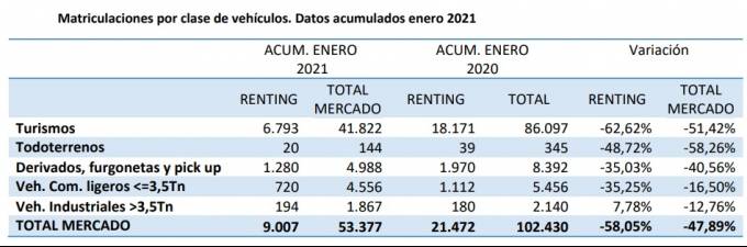 Las matriculaciones de renting caen un 58,05% en enero (9.007 unidades), según datos facilitados por la AER.
