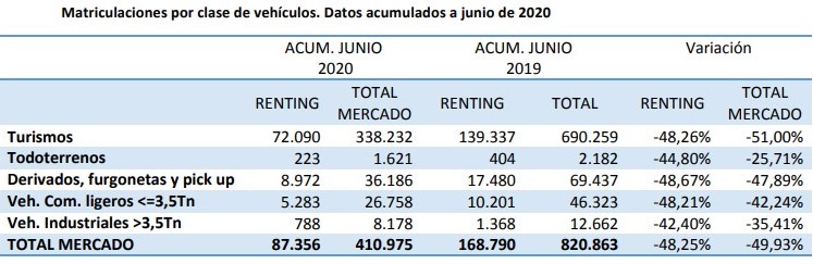 El renting acumula 87.356 automóviles matriculados en el primer semestre de 2020, lo que supone una caída del 48,2% en relación al mismo periodo del año anterior, cuando se contabilizaron 168.790 unidades, según datos facilitados por la Asociación Española de Renting de Vehículos (AER). El peso del renting en el total de las matriculaciones se sitúa en el 21,26%.