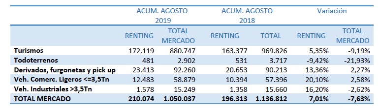 Para Agustín García, "a pesar de que en agosto el renting registró una caída del 8,66%, en las matriculaciones de vehículos, el sector mantiene un crecimiento del 7,01% en el acumulado y aumenta la distancia con respecto a los datos totales de matriculaciones. De este modo, mientras a julio la diferencia entre la caída del mercado y el crecimiento del renting era de 13,68 puntos, a agosto, la distancia acumulada es de 14,64 puntos, dado que el mercado total ha caído un 7,63% y el renting ha aumentado un 7,01%. En cuanto al descenso registrado en agosto, creemos que no es alarmante, puesto que comparamos el mes con un agosto de 2018 excepcional, que anotó un incremento del 37,72%. No obstante, esperamos que el renting, en los próximos meses, continúe creciendo y ganando peso en el mercado".
