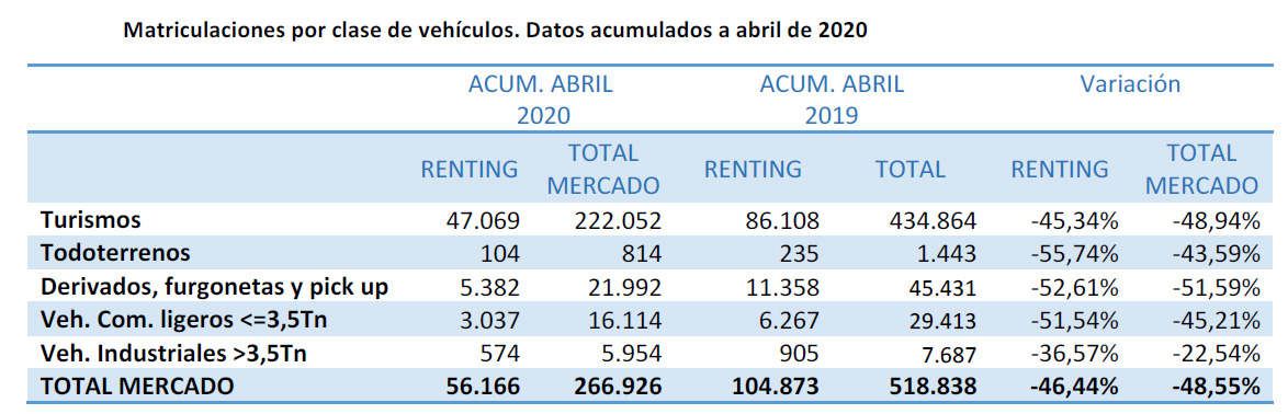 En cuanto a los resultados del mercado total en España, las matriculaciones registran un descenso acumulado del 48,55%, con 266.926 unidades y el peso del renting en el total de las matriculaciones se sitúa en el 21,04%.