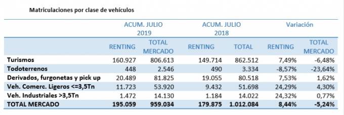 Hasta julio de 2019, las matriculaciones en renting se elevan a 195.059 unidades, lo que supone un crecimiento del 8,44% sobre el mismo periodo de 2018. El peso total del renting supone ya un 20,34% de las matriculaciones en España.