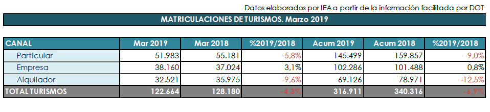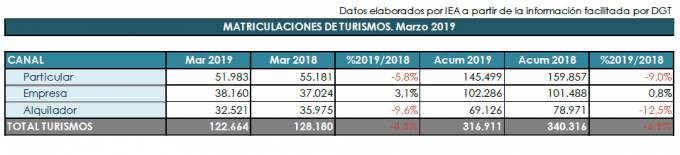 En marzo de 2019, se matricularon en España 122.664 turismos y todoterrenos, lo que significa una caída del 4,3% respecto al mismo periodo del año pasado, por lo que ya van siete meses seguidos en los que descienden las ventas, según datos facilitados por Anfac, Faconauto y Ganvam. Por canales, particulares ha registrado 51.983 unidades, un 5,8% menos; alquiladores, 32.521 matriculaciones (-9,6%); y sólo crece el canal de empresas, con 38.160 unidades (+3,1%).