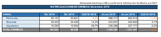Este descenso se produce a pesar del buen comportamiento registrado en diciembre, cuando las ventas se incrementaron un 6,6% en relación al mismo mes de 2018, ascendiendo a 105.853 las unidades entregadas. Por canales, el de particulares ha seguido a la baja, cayendo las ventas un 6,9% (50.137 unidades), mientras que el de empresas ha subido un 14,3% (39.423 unidades) y el de alquiladores un 48,7% (16.293 matriculaciones).