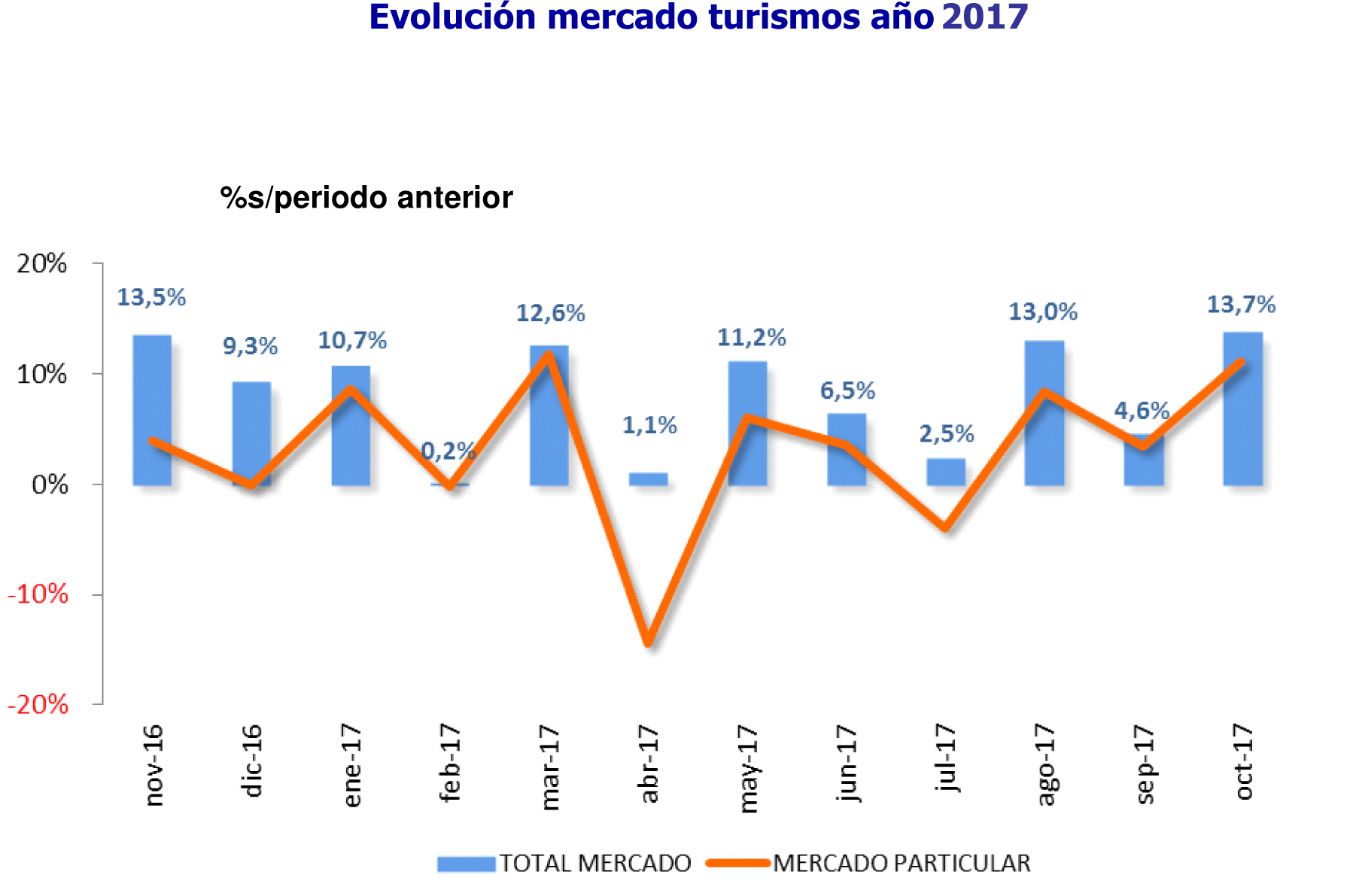 El mes de octubre ha cerrado con unas matriculaciones de turismos de 94.676 unidades lo que supone una subida del 13,7% en comparación con el mismo mes del año pasado. En el acumulado de matriculaciones de los 10 primeros meses del año, el mercado de turismos registró 1.027.818 unidades, lo que supone un 7,3% más que en el periodo enero-octubre de 2016, según los datos de Anfac. Una vez más hay que destacar que, en el conjunto del año, son las matriculaciones por parte de los particulares las que menos crecen, con un 3,1% de subida, mientras que las empresas y alquiladores alcanzan tasas superiores, con un 14,3% y un 8,9% de incremento, respectivamente.
