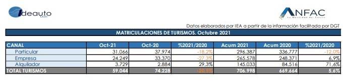 En el acumulado anual los datos reflejan que, entre enero y octubre de 2021, se han vendido 706.998 unidades, un 5,6% más que en los 10 primeros meses de 2020. Si bien, respecto a 2019, se observa que las matriculaciones han caído un 33%.