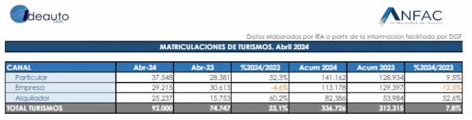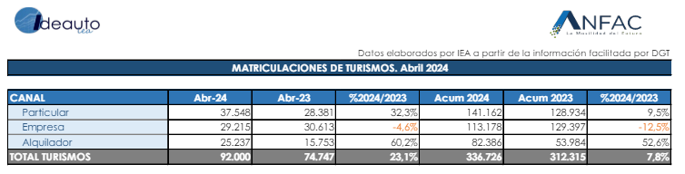 Así, entre marzo y abril de 2024, se han matriculado 186.840 unidades, lo que supone un 7,2% más que en el mismo período de 2023. Comparando estos dos meses se elimina así el efecto estacional de la Semana Santa.