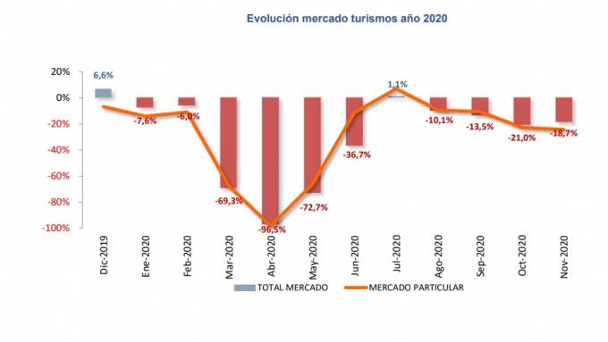 Las matriculaciones de turismos y todoterrenos registraron un descenso en noviembre de un 18,7%, con 75.708 unidades matriculadas. La segunda ola de la pandemia y la grave crisis económica y social asociada está profundizando la caída de las ventas en todos los mercados, según señala Anfac.