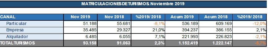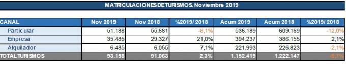 El canal de particulares continúa en descenso con unas ventas un 8,1% inferiores al mismo mes de 2018, hasta las 51.188 unidades. El canal mantiene su tendencia a la baja, aunque se modera un poco este mes. Sin embargo, esta comparación se realiza con los datos de noviembre de 2018, que ya fueron negativos y los volúmenes no son altos. Este canal es el único que registra cifras negativas en noviembre. Empresas, por su parte, consigue una subida de sus ventas del 21%, hasta las 35.485 unidades, y el canal de alquiladores crece un 7,1%, hasta las 6.485 unidades matriculadas.