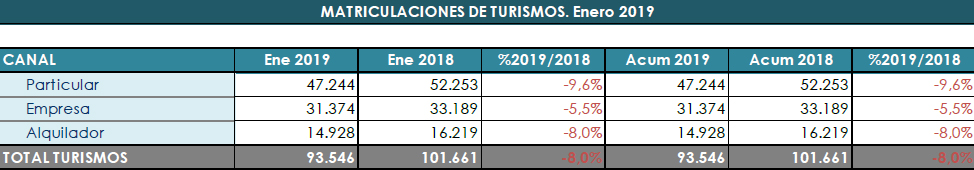 Las matriculaciones de turismos y todoterrenos descendieron un 8% en enero respecto al mismo periodo de 2018, registrándose un total de 93.546 unidades. Esto significa que las ventas llevan cayendo cinco meses consecutivos, algo que no ocurría desde la crisis, según datos publicados por Anfac, Ganvam y Faconauto.