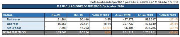 La nota positiva es que en diciembre de 2020 se registraron prácticamente las mismas matriculaciones que en diciembre de 2019. En total, se contabilizaron 105.841 unidades matriculadas de turismos y todoterrenos, casi igual que un año atrás. El canal de particulares, con un incremento del 3,5%, y sobre todo el de empresas (+18,1%) tiraron del carro en diciembre y compensaron la caída del canal de alquilador (-54,6%), que se ha derrumbado durante todo el 2020 excepto en agosto.