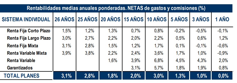 Desde el mes de abril, los partícipes han visto incrementar su ahorro en más de 7.700 millones de euros gracias a la revalorización en sus carteras. En el largo plazo los Planes de Pensiones continúan registrando una rentabilidad media anual (neta de gastos) del 3,1% y, en el medio plazo (10 y 15 años), presentan una rentabilidad del 3% y 2% respectivamente.