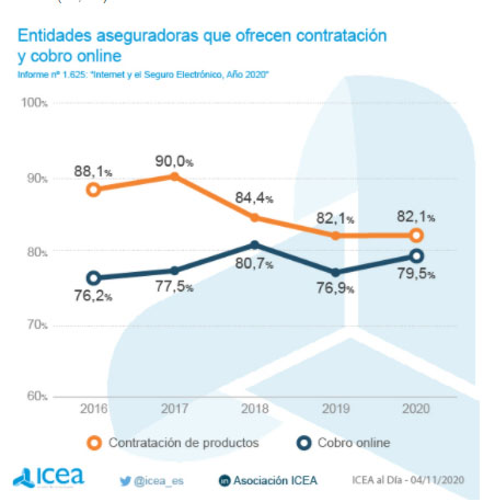 El porcentaje de compañías de seguros que permiten la contratación de productos de manera online es alto, aunque ha empeorado en referencia a los últimos años. Así, según los datos de ICEA, el 82,1% -similar a 2019- de ellas lo ofrece, aunque lejos queda el 88% de 2016 o el 90% de 2017.
