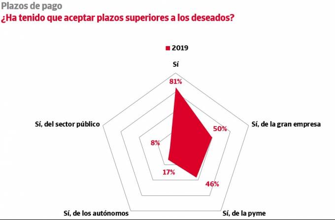 El mejor comportamiento se ha registrado en el sector público, donde solo un 8% de las empresas tuvieron que aceptar una extensión de los plazos de pago, un porcentaje similar a 2018. La capacidad de los autónomos para imponer plazos de pago también se mantiene estable, en el 17%. En el otro extremo está la gran empresa, que impone plazos de pago al 50% de sus proveedores y el mayor empeoramiento ha tenido lugar en el segmento de las pymes, que imponen plazos de pago superiores a los que desean al 46% de las empresas.