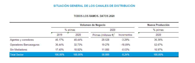 Agentes y corredores de seguros, la mediación tradicional, comercializó el 48,44% del total de primas que se firmaron en España durante 2020, según los datos de ICEA. Esto significa que este canal aumentó su cuota de mercado en un 2,3% respecto al año anterior. Todo lo contrario a lo que le ocurrió a los OBS (Bancaseguros) que han visto retroceder su cuota de mercado en casi un 4% hasta el 32,73% del volumen de negocio total. El negocio directo (sin mediadores) mejoró su cuota un 1,5% y se responsabiliza ya del 19% de los seguros que se venden en España.
