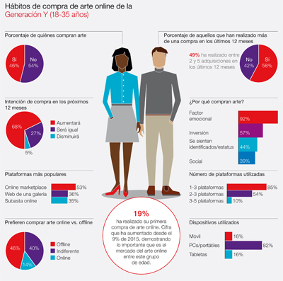 En este despegue de la venta de arte on-line juegan un papel especialmente destacado los ‘millennials’ o Generación Y. El 19% de los compradores de entre 18 y 35 años afirman haber realizado su primera adquisición artística en Internet, cuando hace un año eran sólo el 9%. Esta generación destaca por ser el grupo más influido por las redes sociales a la hora de comprar arte. El 42% reconoce que las redes sociales juegan un papel importante en su decisión final, mientras que la media global se sitúa en el 31%.