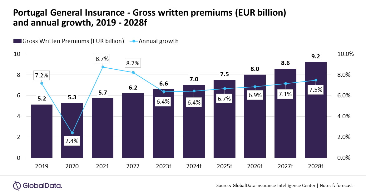 La industria de seguros de Portugal crecerá de media un 6,9% hasta 2028 y pasará de los 6.600 millones de euros en primas con los que cerrará este 2023 a los 9.200 que se esperan para 2028, según los datos de GlobalData. Más concretamente, el análisis indica que durante 2023 y 2024 el crecimiento sea del 6,4% y después incrementarse hasta un aumento del 7,5% con el que finalizará 2028. Apunta la firma de datos que estas previsiones se basan en la creciente demanda de seguros de Salud por la mayor concentración del mercado, así como por el aumento de las ventas de vehículos y el mayor índice de ciberataques.