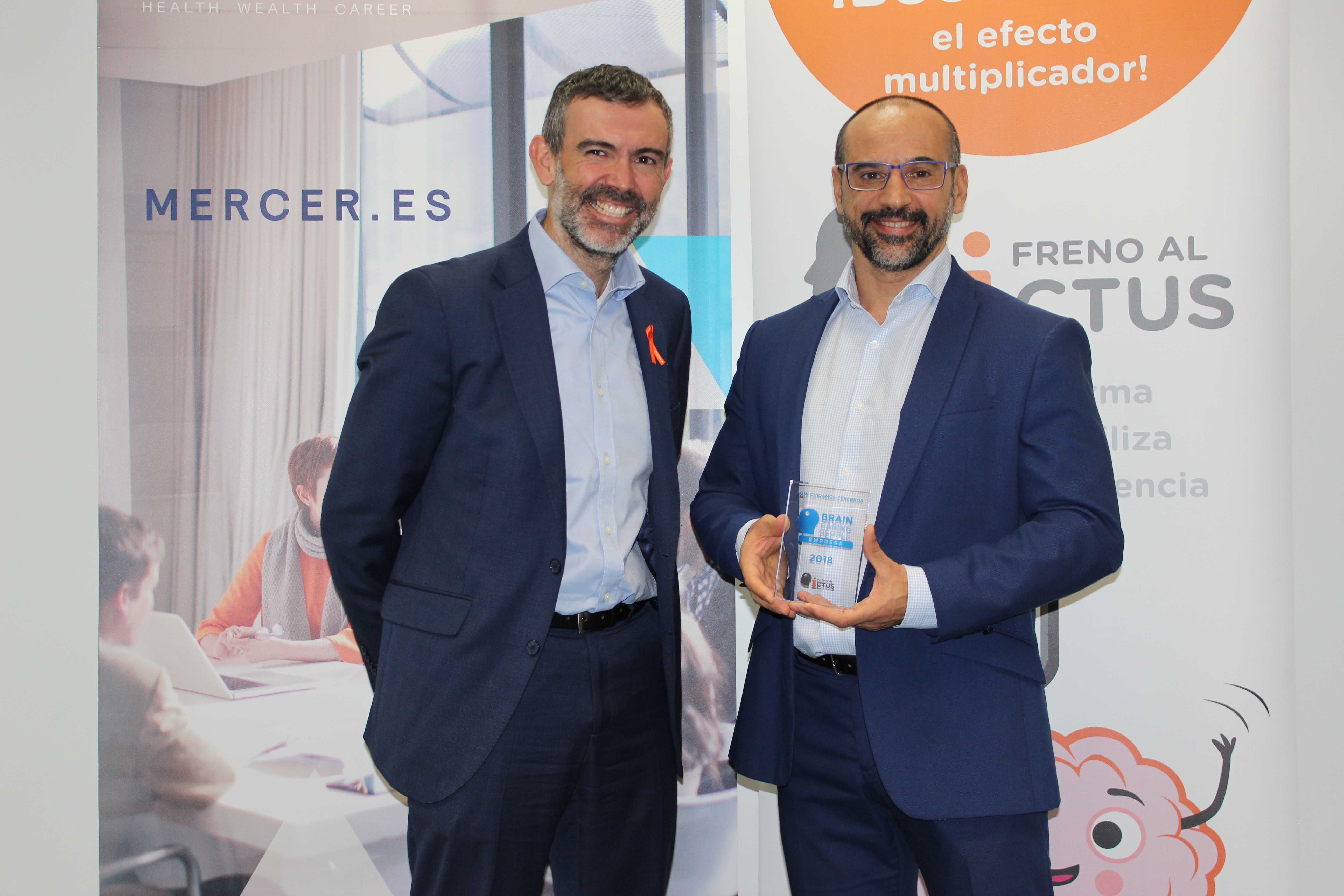 Mercer España ha sido reconocida con el sello Brain Caring People Empresa que cuenta con el aval social de la Sociedad Española de Neurología (SEN), Fundación del Cerebro y la Asociación Española de Servicios de Prevención Laboral (Aespla), por realizar iniciativas con un impacto positivo en la salud cerebral de la sociedad, habiendo ejecutado acciones conjuntas con Freno al Ictus dentro de su proyecto bewell@mercer. La distinción fue entregada por Julio Agredano, presidente de Freno al Ictus, el 14 de noviembre, a Juan Vicente Martínez, director de RRHH de Mercer.