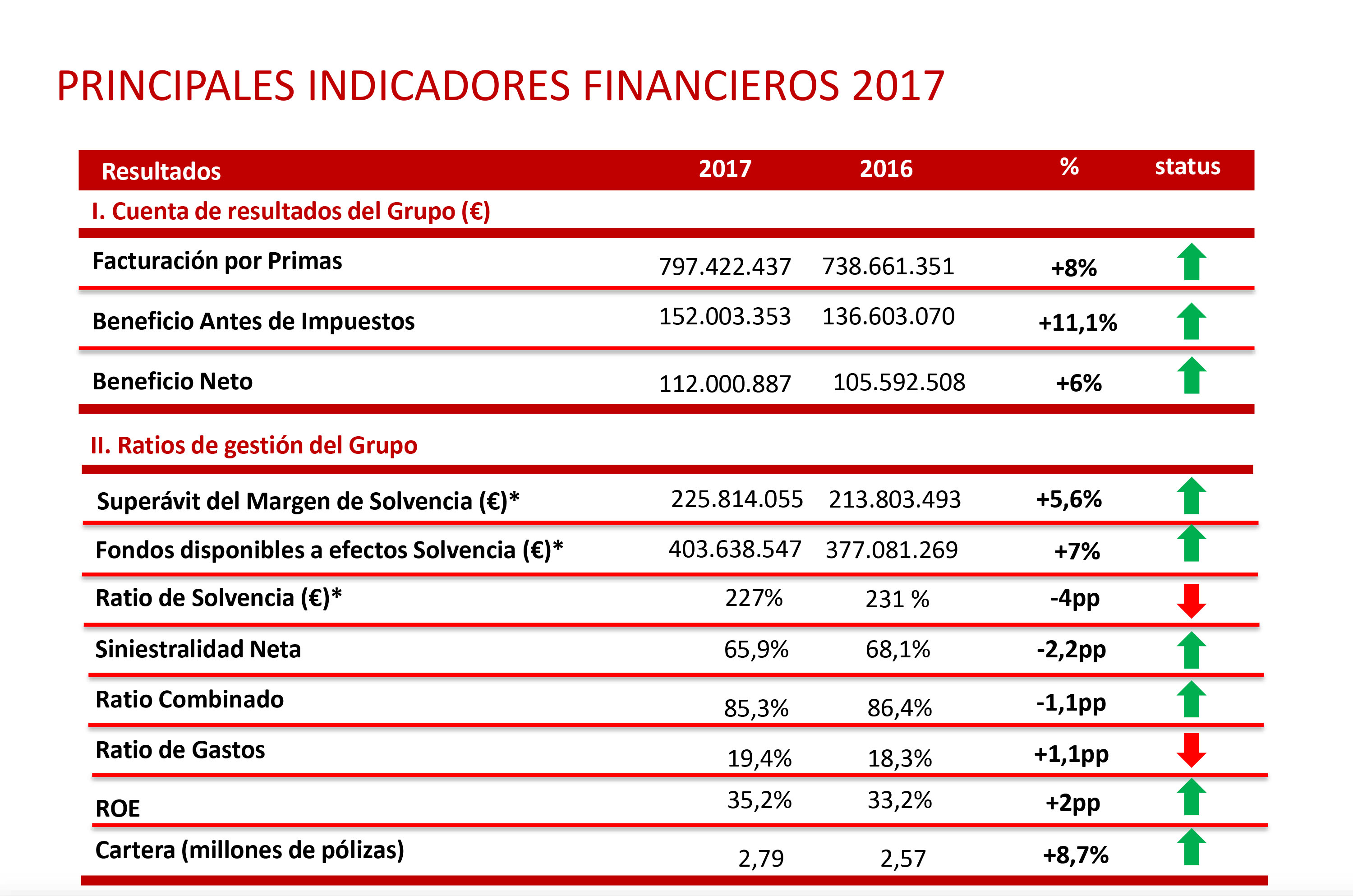 En cuanto a la siniestralidad neta de grupo se situó en el 65,9%, 2,2 puntos porcentuales menos que en 2016, gracias, en gran medida, al excelente indicador obtenido en el ramo de Autos (70,1%), 6,9 puntos mejor que el sector (77%). Por su parte, el ratio combinado de Autos volvió a mejorar descendiendo hasta el 86,9%, lo que supone mantener un diferencial de 8,7 puntos con la media del ramo (95,6%).
