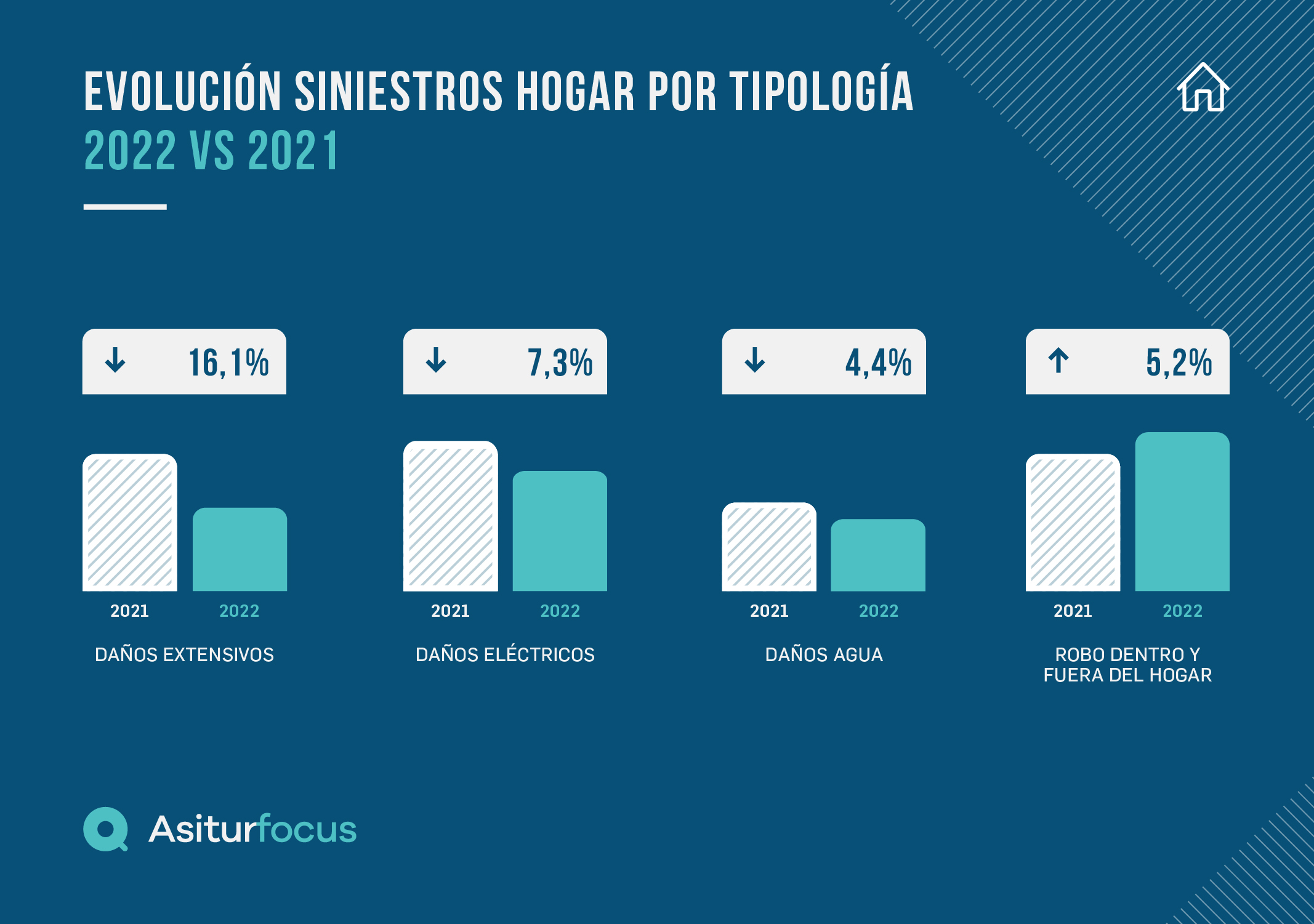 El Observatorio Asitur Focus ha analizado también la evolución de las distintas tipologías de sinestros constatando una disminución de la mayoría ellas, especialmente de las dos más vinculadas a los fenómenos meteorológicos, como son la de daños extensivos (-16,1%) y la de daños eléctricos (-7,3%). El resto de tipologías con evolución negativa fueron: cristales (-7%), daños agua (-4,4%), roturas (-4%) e incendios (-2,7%). Por su parte, la única tipología de siniestros que ha aumentado en relación con 2021 ha sido la de robo, tanto fuera del hogar (3,7%) como dentro del hogar (6,6%).