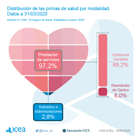 La distribución de primas de Salud está compuesta con el 89,2% a Asistencia Sanitaria y un 8% a reembolso. La mayoría de las pólizas (97,2%) se refieren a prestaciones de servicio, mientras que algo menos del 3% a subsidios e indemnizaciones.