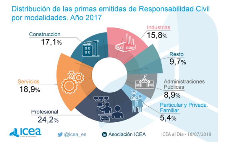 Según los datos de ICEA la modalidad de Profesionales representa más del 24% del total de primas de RC y el 8,1% de las pólizas. En importancia le sigue Servicios con el 19% de las primas y el 15% de las pólizas y cierra el pódium Construcción con el 17% de las primas y el 11% de las pólizas.
