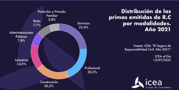 Un informe de ICEA destaca que, dentro de las distintas modalidades, la correspondiente a Servicios representa el 23,6% de las primas y el 14,1% de las pólizas. En importancia y utilización le sigue la modalidad de Profesional con el 20,5% de las primas y el 8,6% de las pólizas, y cierre el podio la RC Construcción con el 20,2% de las primas y el 10,9% de las pólizas.