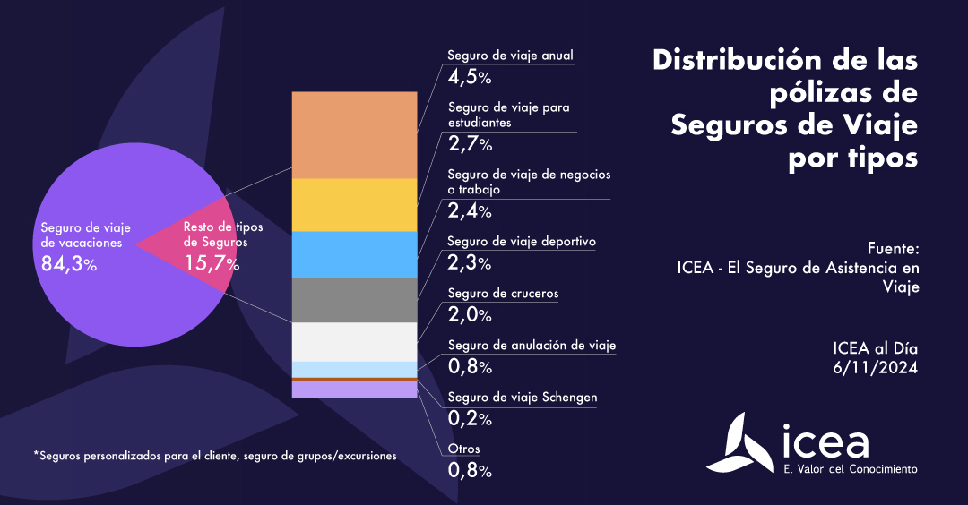 La modalidad de seguros de Viaje que acapara las mayores ventas es la de vacaciones, con un 84,3% del total de las pólizas vendidas, según ICEA. El otro 15,7% de pólizas está repartido entre el resto de modalidades ofertadas, siendo el seguro de viaje anual el que más peso tiene, con un 4,5%. "Los tres seguros de viajes más ofertados por las entidades son los de vacaciones y de viaje anual, los cuales son ofertados por el 100% de las entidades analizadas, seguidos por el seguro de anulación de viaje, que es ofertado por el 85,7% de las entidades", precisa.