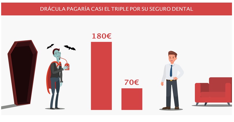 Tras observar el uso que el conde hace de su dentadura, la compañía estima que debería contratar un seguro completo que incluyera, además de servicios básicos como limpiezas y extracciones, otros como la reconstrucción por rotura de colmillos. En total, tendría que pagar alrededor de 180 euros anuales. En todo caso, Drácula formaría parte de ese 25,3% de la población que opta por un seguro dental más completo.