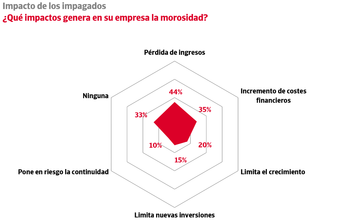 Otras conclusiones de este estudio son que el 44% de las empresas españolas afronta pérdidas significativas de ingresos a causa de la morosidad y un 35% registra un incremento de sus costes financieros. Además, el 15% se ve obligada a limitar sus nuevas inversiones y un 20% a frenar su expansión comercial.