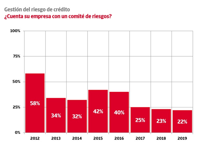 Un dato preocupante que se desprende el informe es la constatación de que las compañías llevan desde 2017 desmantelando los departamentos dedicados al recobro y al control de impagos que habían puesto en marcha en los momentos más duros de la crisis. Si en 2012 el 58% de las empresas contaba con estos órganos formales, en 2019 apenas los mantienen el 22%. Otro dato en la misma dirección: sólo el 28% de las empresas cuentan con departamentos específicos de riesgos, frente al 49% de 2012.