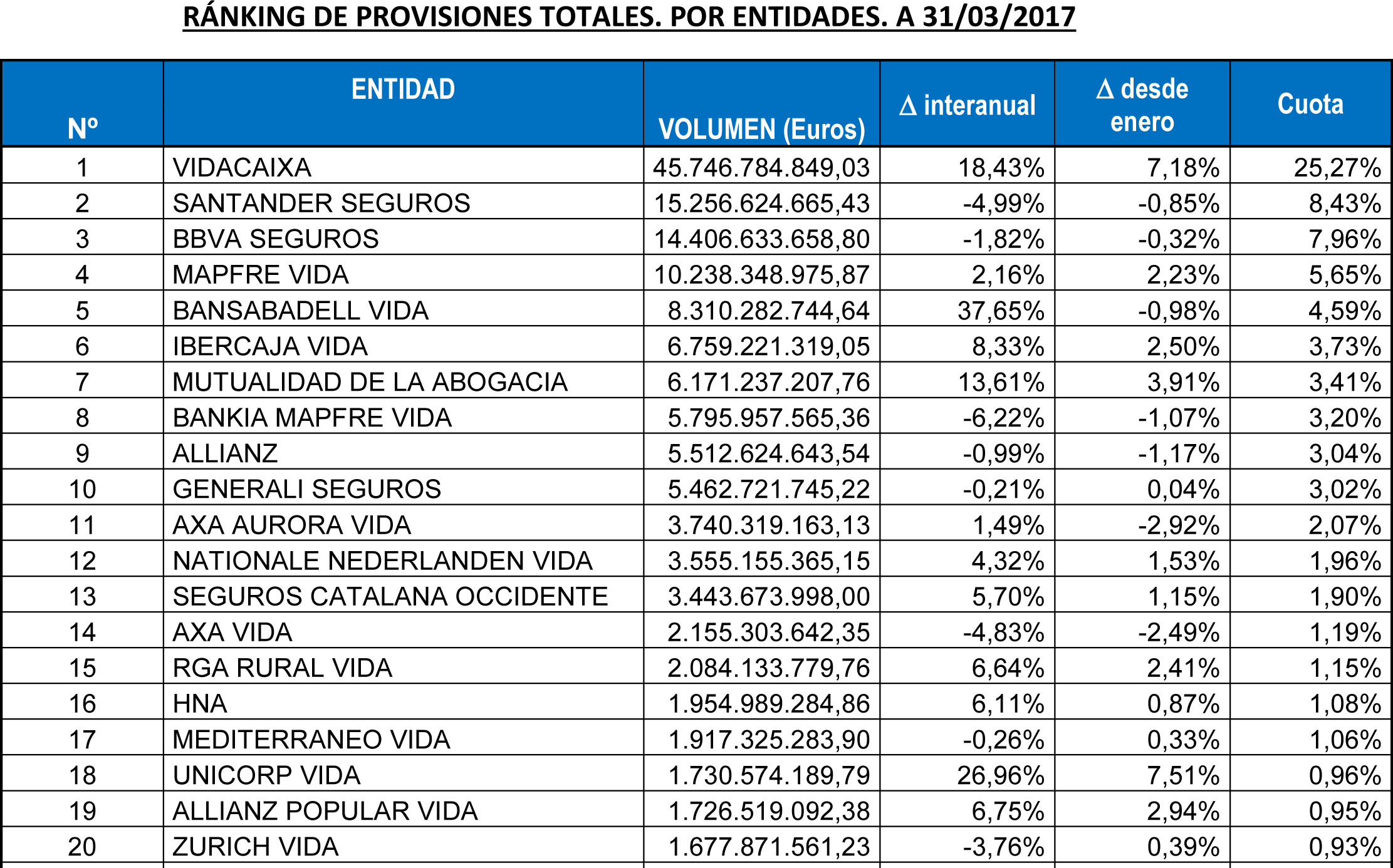 El ranking de las principales entidades aseguradoras del ramo de Vida por volumen de provisiones lo sigue dominando de lejos VidaCaixa, con una cuota de mercado del 25,27% y un ahorro gestionado de clientes que superaba a finales de marzo los 45.746 millones de euros, según los datos de ICEA. El quinteto ganador lo completan Santander Seguros (8,43%, 15.256 millones), BBVA Seguros (7,96%, 14.406 millones), Mapfre Vida (5,65%, 10.238 millones) y Bancsabadell Vida (4,59%, 8.310 millones de euros), entidad que se cuela en esta clasificación tras desplazar a Ibercaja Vida y después de haber incrementado el volumen de provisiones en un año un 37,65%, el mayor avance de todo el sector.