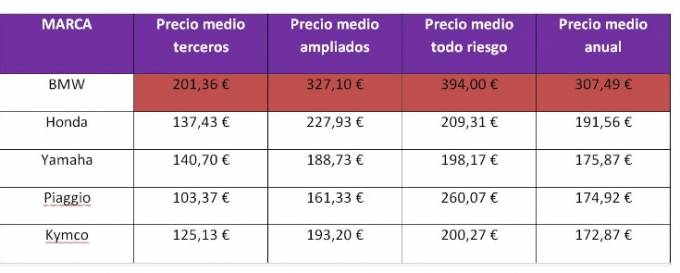 En el otro extremo, las marcas más baratas son el comparador, Kymco con una prima media anual de 172,87 euros