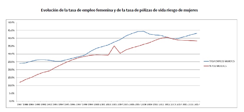 En los años 90, cuando el 27% de las mujeres tenían empleo, el porcentaje de pólizas de Vida en manos de mujeres era prácticamente también del 27%. Sin embargo, a partir de ese año, la tasa de empleo de las mujeres comenzó a crecer a un mayor ritmo que al que se protegían, coincidiendo la mayor brecha de desprotección con la reciente crisis económica, cuando a una tasa de empleo del 44% le correspondía un nivel de protección del 35%. En 2011 las cifras volvieron a aproximarse hasta 2013, que la brecha volvió a abrirse y se está ampliando en la actualidad.