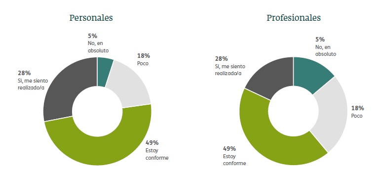 El estudio recoge también los índices de realización de las españolas, tanto personales como laborales, constatando que el 49% de las mujeres participantes en el estudio se siente conforme con su vida personal, y el 42% con su vida profesional. Aunque muestran cifras similares de satisfacción respecto a su carrera profesional, son las que tienen hijos quienes afirman sentirse más realizadas personalmente (30%), respecto a las que no los tienen (26%).