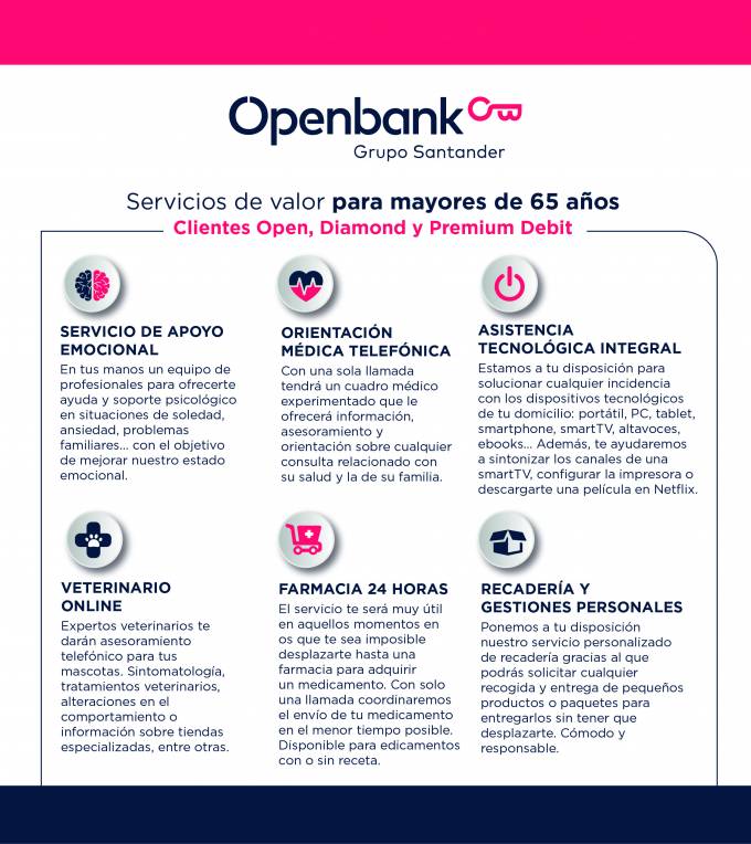 Multiasistencia y Openbank han lanzado al mercado de manera conjunta un programa de servicios gratuito para los clientes seniors de la entidad bancaria. El objetivo del mismo, según indican, es "posicionarse del lado de los mayores de 65 años" ante la situación que atravesamos por el coronavirus. Ofrecen un paquete "pensado y diseñado para ellos, que les ayuden a sobrellevar las próximas semanas de crisis sanitaria hasta completar las fases de la desescalada". De esta manera quieren ayudar al colectivo que ha resultado más vulnerable y sensible a la pandemia y que sufre en primera persona la enfermedad y el aislamiento, indican.