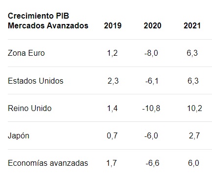 Loas economías avanzadas serán las más afectadas por la recesión con una caída acumulada del PIB del 6,6%. El Reino Unido, ya sobrecargado por su salida de la Unión Europea, se enfrenta a un descenso del 10,8%. No se prevé que el desempeño de la zona euro sea mucho mejor, con una previsión de caída del PIB del 8,0%. Estados Unidos y Japón experimentarán, previsiblemente, descensos ligeramente menos pronunciados, del 6,1% y el 6,0% respectivamente.