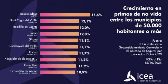 El estudio 'Geoposicionamiento comercial' y el informe 'El Mercado de Seguros por Provincias. Estadística año 2023' elaborados por ICEA muestra que Benalmádena (+15,45), Sant Cugat del Vallès (+12,1%) y Boadilla del Monte y Palma (+12%) fueron los municipios donde más pólizas de este ramo se suscribieron el pasado año.