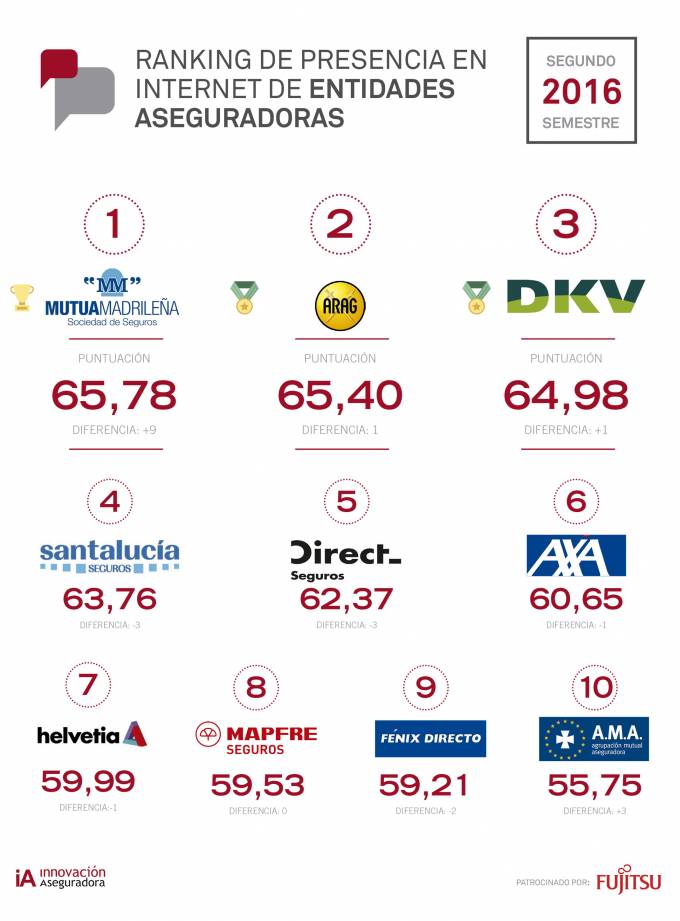Mutua Madrileña lideró el ranking de presencia en internet de entidades aseguradoras durante el segundo semestre de 2016. Así lo señala el informe que ha elaborado Innovación Aseguradora donde se destaca que la compañía ha mejorado en 9 posiciones la última medición. En el pódium se encuentra también Arag y DKV Seguros después de haber mejorado una posición respecto a junio del pasado año.