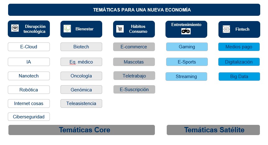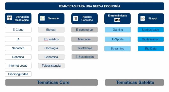En concreto, los gestores del fondo han definido dos tipos de temáticas que formarán parte de la cartera: 'Temáticas Core', aquellas de impacto más relevante y entre las que se encuentran las compañías relacionadas con la disrupción tecnológica, de sectores vinculados al bienestar y a los nuevos hábitos de consumo; y 'Temáticas Satélite', de los sectores del entretenimiento y las Fintech. En las primeras, Mutuactivos invertirá a través de fondos de inversión; y en las segundas, a través de fondos o ETFs más específicos con elevado potencial y menor ponderación. En particular, el vehículo invertirá entre un 60-70% en temáticas core y en torno al 30-40% en temáticas satélite.