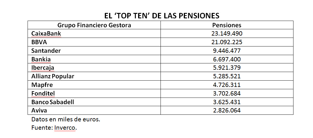 VidaCaixa, BBVA, Santander, Bankia, Ibercaja, Allianz Popular, Mapfre, Fonditel, Sabadell y Aviva concentran entre todas un 84% de cuota de mercado en Pensiones, según el ranking de comercialización en España de IIC y Fondos de Pensiones por grupos financieros elaborado por Inverco. Con datos a junio, estas entidades sumaban un ahorro gestionado en Pensiones de 86.472 millones de euros de un total de 103.004 millones. El resto de las entidades, un total de 98, se tienen que conformar con repartirse el 16% del mercado.