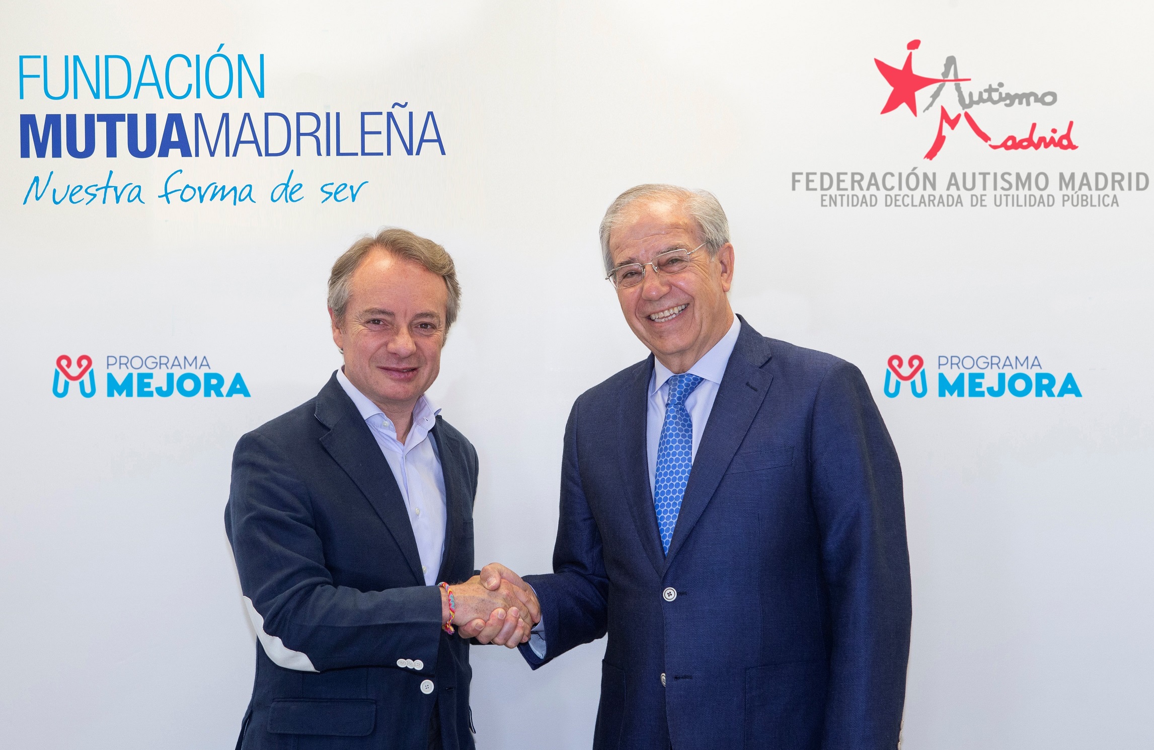 Lorenzo Cooklin, director general de la Fundación Mutua, y Manuel Nevado, presidente de Federación Autismo Madrid, han firmado el acuerdo de colaboración que está previsto que beneficie a cerca de un centenar de niños y niñas con TEA de entre 2 y 15 años que recibirán servicios de rehabilitación (fisioterapia, logopedia o psicología), en función de sus necesidades. La ayuda se prestará en las instalaciones de las entidades federadas beneficiarias de las ayudas, en distintos puntos de la Comunidad de Madrid.