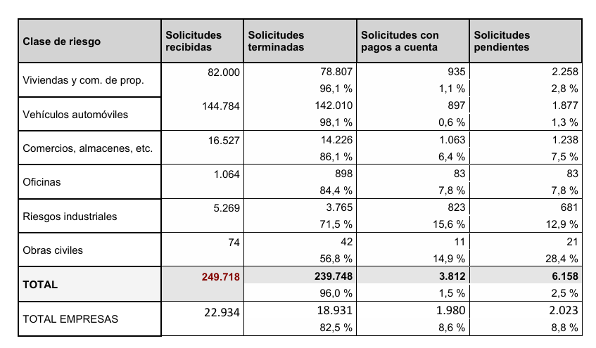 Del total de siniestros, la mayoría (245.350) se refieren a daños materiales, 4.368 son por pérdida de beneficios y 266 por daños personales.