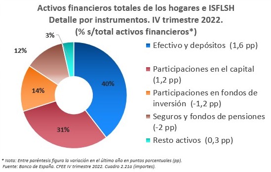 A finales de 2022, el grueso de los activos financieros de los hogares españoles se mantuvo en efectivo y depósitos, lo que representa el 40% del total. Un 31% se destinó a participaciones en el capital y un 14% a participaciones en Fondos de Inversión. Los seguros y Fondos de Pensiones siguen a la cola acaparando el 12% del ahorro de las familias. Todos estos son datos extraídos de las Cuentas Financieras de la Economía Española correspondientes al cuarto trimestre de 2022 y publicadas por el Banco de España.
