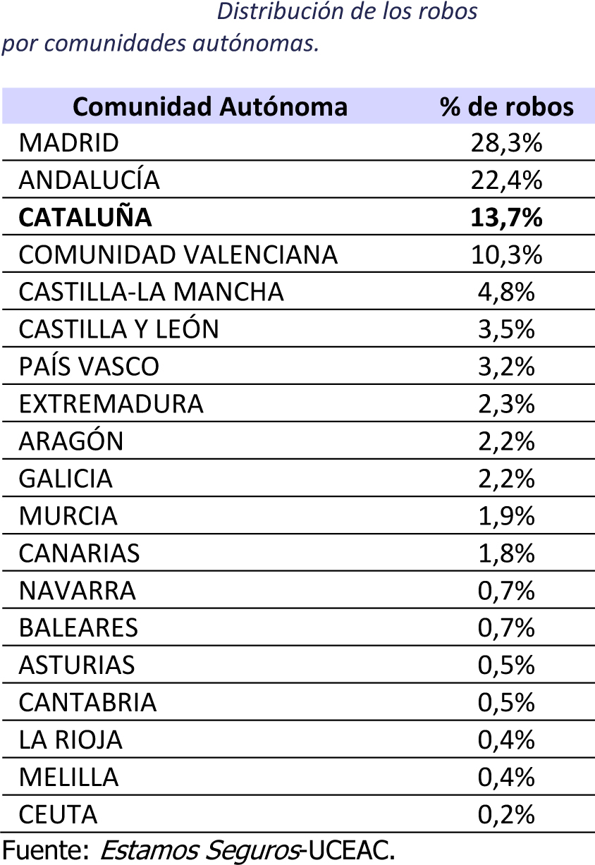Cataluña es el tercer territorio de España donde más robos de coches se producen, el 13,7% del total. Los datos del sector asegurador indican, en ese sentido, que 1 de cada 7 turismos que se roban en España lo son en Cataluña. Sin embargo, Unespa aclara que esta realidad tiene más que ver con la importancia demográfica y económica de Cataluña que con una mayor o menor intensidad de los robos en la comunidad. En términos relativos, sin embargo, la comunidad autónoma se encuentra dentro de la media. Es decir, Cataluña no es ni bastante más peligrosa (como le ocurre a la Comunidad Autónoma de Madrid o Andalucía) ni mucho menos (como pasa con Asturias o Galicia) que el resto del país. Además, la gravedad de los robos ocurridos en suelo catalán es bastante menor que la del conjunto de España. En concreto, el coste medio de cada turismo que se roba ahí es un 21% inferior al del resto del territorio nacional.