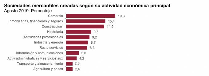 En el pasado mes de agosto se crearon 5.366 sociedades mercantiles en España, un 8,6% menos que en el mismo mes de 2018, según datos publicados por el INE. Y se disolvieron 1.664, lo que significa un 14,2% menos que un año atrás. Por sectores, donde más empresas se crearon fue una vez más en el de Comercio (23,5% del total), por delante del conjunto donde el INE agrupa a empresas inmobiliarias, financieras y seguros, que acapararon el 15,4% de las nuevas empresas.