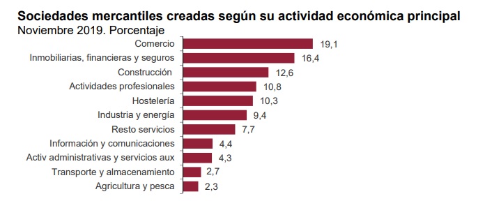 En el mes de noviembre se crearon se crearon 7.331 sociedades mercantiles, un 8,0% menos que en el mismo mes de 2018. El capital suscrito para su constitución supera los 320 millones de euros, con un incremento anual del 4,9%.